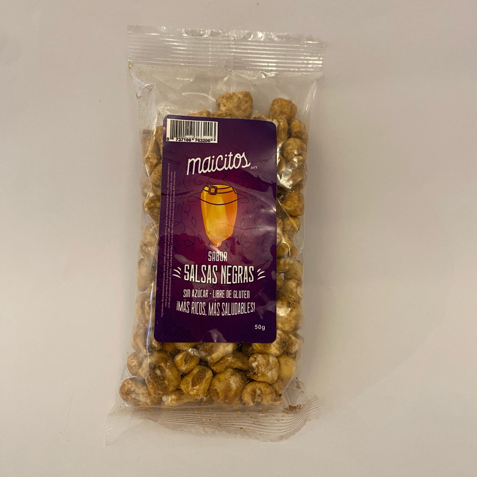 Disfruta del auténtico sabor con Maicito Salsas Negras, un snack crujiente elaborado con ingredientes naturales, sin sellos y sin culpas. Inspirado en la intensidad de las salsas orientales, este maíz tostado combina un toque salado, dulce y umami que conquista el paladar desde el primer bocado.